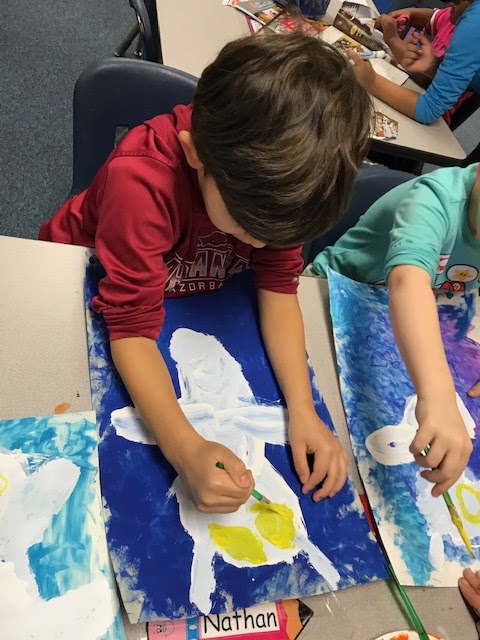 Mrs. Parrish assisted The Lizards in captioning the essence of nature by painting snow owls. This idea coincides with our animal theme and was a three week project. A portion of students concluded today by adding details on their owls and snow falling from the sky.