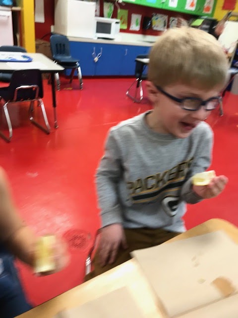 This week The Lizards have been discovering more about their five senses and how they use them everyday. Today, we focused on our sense of taste. I presented each student with a slice of lemon (sour), a pretzel stick (salty), and a few M&M's (sweet). After tasting each item, students recorded their information on a data sheet. Most students liked more than one flavor, but M&M's was definitely our winner!